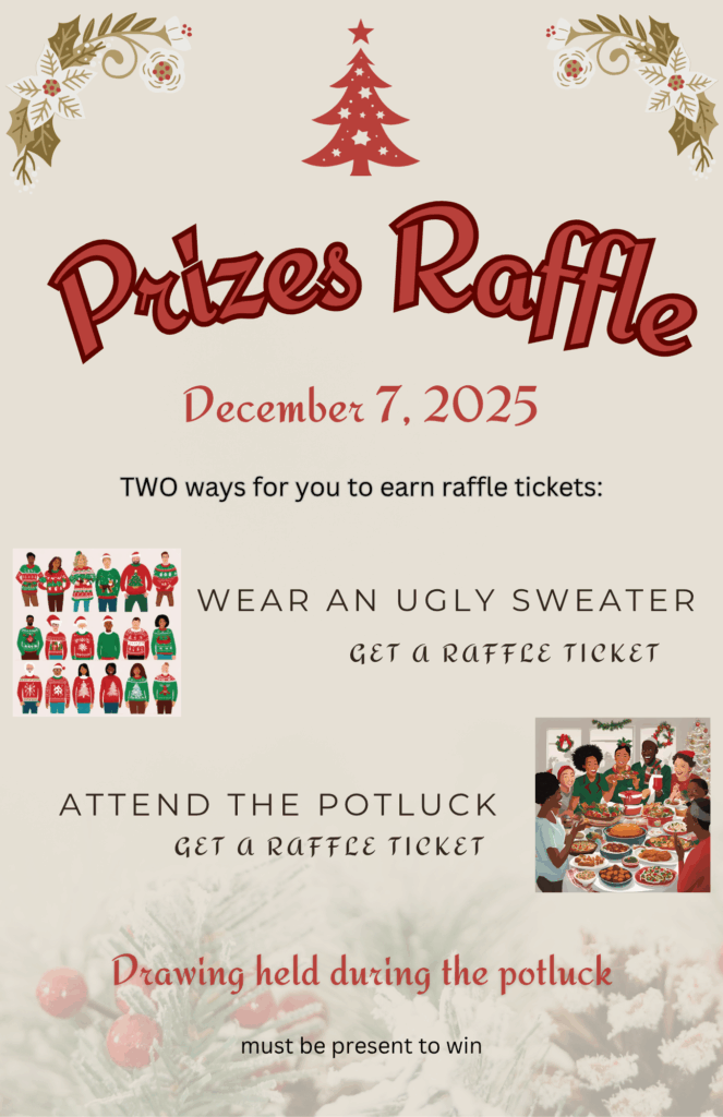 Santa & Mrs. Claus photo op! Gift exchange! Raffle prizes! Great food and fellowship! Don’t miss it!