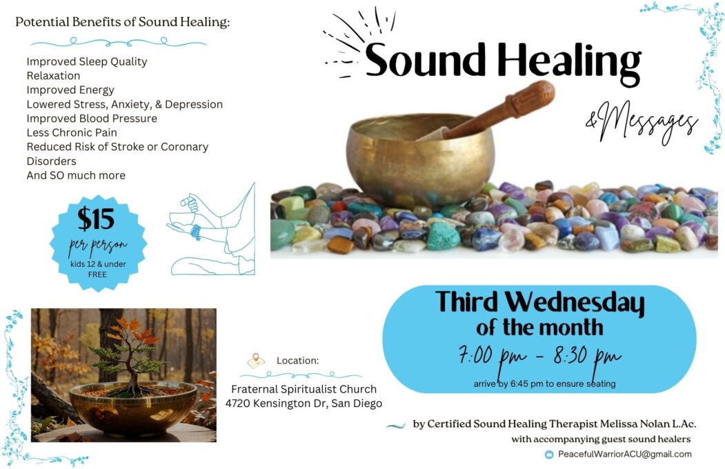 The Sound Healing & Messages event is now on the THIRD (3rd) Wednesday of each month & runs from 7:00 pm to 8:30 pm. Please arrive by 6:45 pm to ensure comfortable seating & not to disturb others.